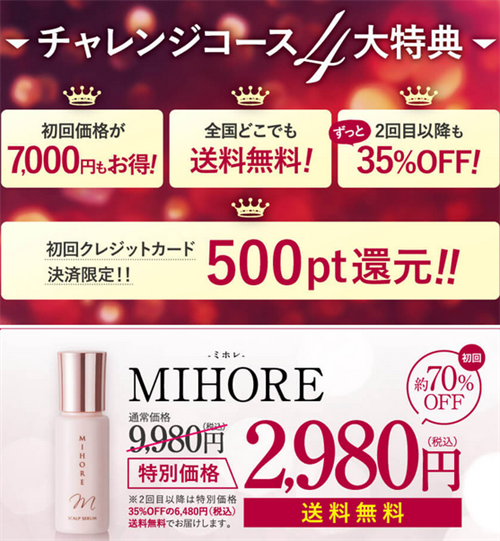 ミホレ育毛剤の公式サイトがおすすめされるのは、初めて購入する方が対象ですが、定期購入「チャンレジコース」の初回価格が税込・送料込みで2,980円で購入できることです。